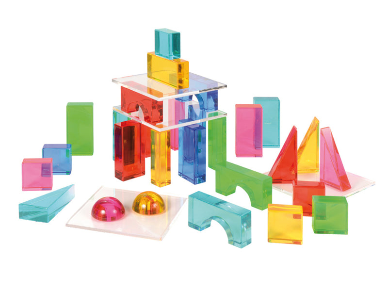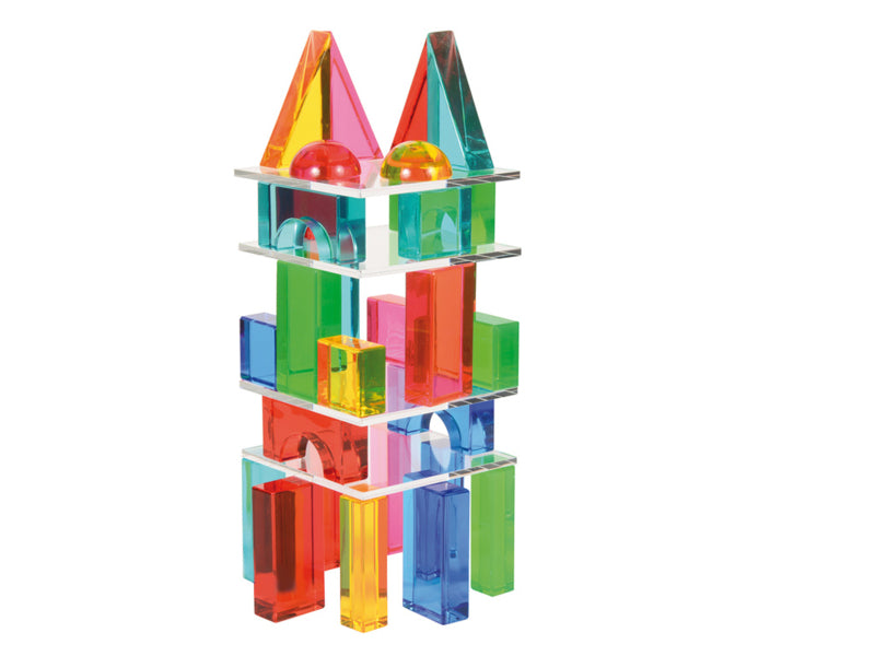 De geo-bouwstenen fascineren tijdens het spelen en hebben met hun glanzende oppervlak en doorschijnende reflecties geweldige kleureffecten. Met zes verschillende vormen en vier vierkante panelen kunnen kinderen doorschijnende structuren met meerdere niveaus maken.