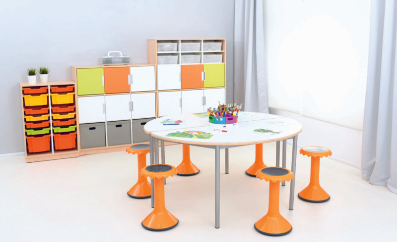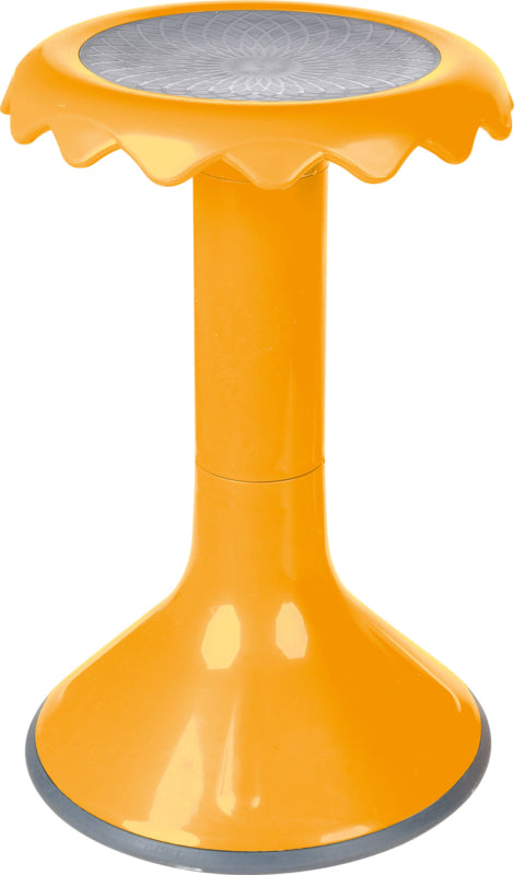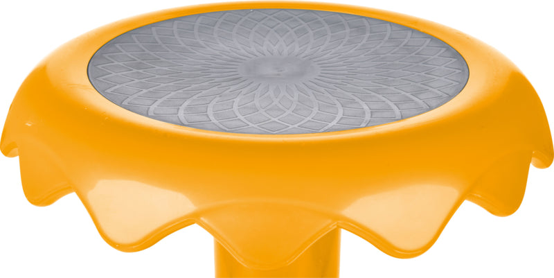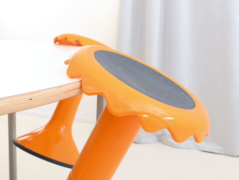 Kruk gemaakt van kunststof en rubber. De rubberen basis van de stoel is in het midden licht bollend.