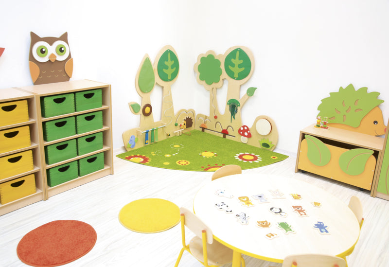 Activiteiten wanden van gelakt multiplex, met sensorische applicaties, doolhoven en boomtakken gemaakt van stof met verschillende texturen.