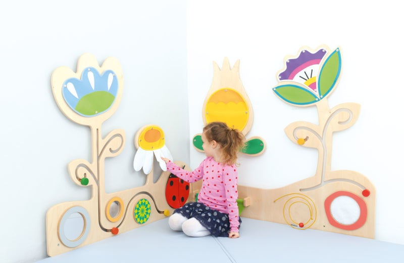 De manipulatieve sensorische wand - weide met slak stimuleert het gevoel van aanraking en het zien van het kind. De muur bevat drie doolhoven van verschillende soorten. De eerste is een slak, de tweede - driehoekige bladeren (hoogte 9 cm) op een metalen buis, en de derde zit in de stengel en bladeren van de bloem. Bovendien kunnen kinderen de witte vacht met MDF aanraken. Elementen van de bloemen zijn bedekt met duurzaam vinyl.