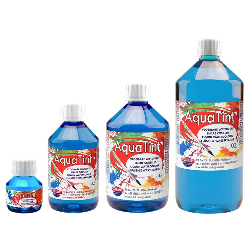 AquaTint is een sterk geconcentreerde vloeibare waterverf met hoogwaardige kleurstoffen. Geeft kleur aan papier, filterpapier, tissues, karton (eierdozen), hout, en andere absorberende materialen (wattenbollen/schijfjes). Veel technieken zijn mogelijk met behulp van: penseel, druppel-pipet, rietje blazen, spatraam, sprayflacon, refill-brush, waskrijtjes enz.