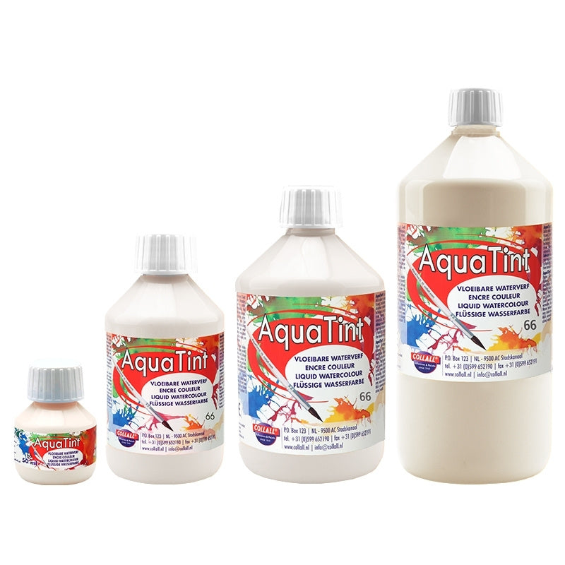 AquaTint is een sterk geconcentreerde vloeibare waterverf met hoogwaardige kleurstoffen. Geeft kleur aan papier, filterpapier, tissues, karton (eierdozen), hout, en andere absorberende materialen (wattenbollen/schijfjes). Veel technieken zijn mogelijk met behulp van: penseel, druppel-pipet, rietje blazen, spatraam, sprayflacon, refill-brush, waskrijtjes enz.