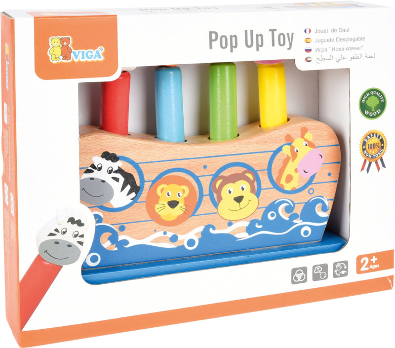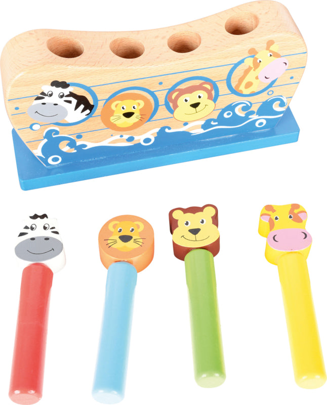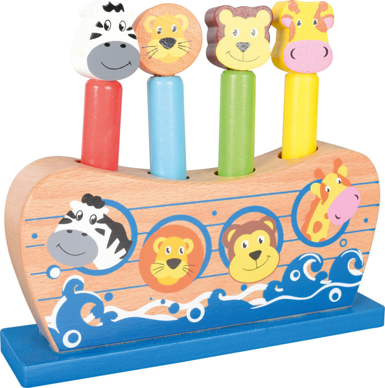 Gemaakt van hout, met vier dieren (zebra, beer, giraf en leeuw). In de gaten onder het dier zitten veren - nadat het dier is ingedrukt en losgelaten, springt het uit de ark.