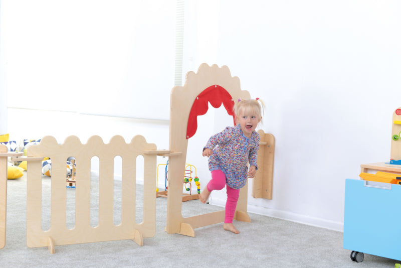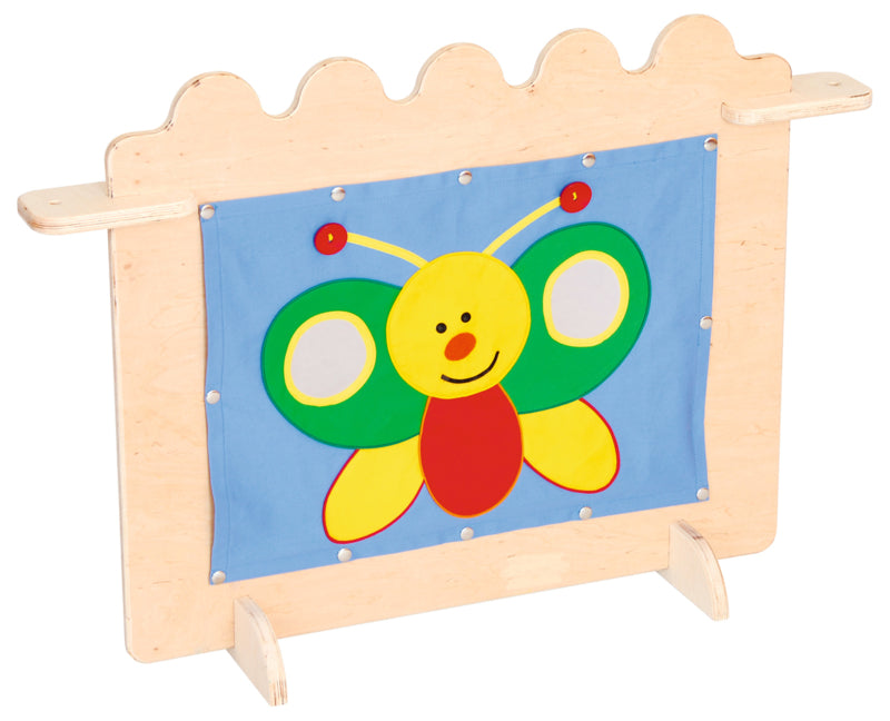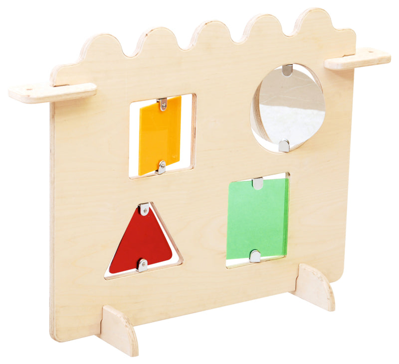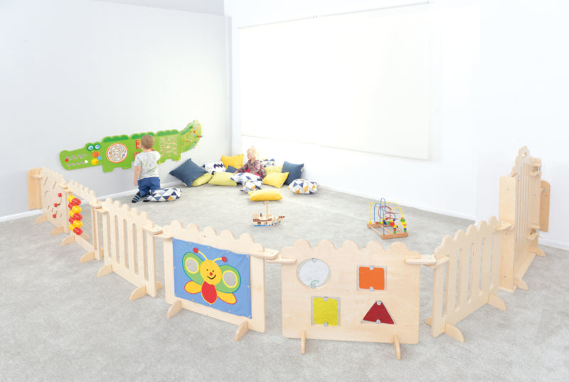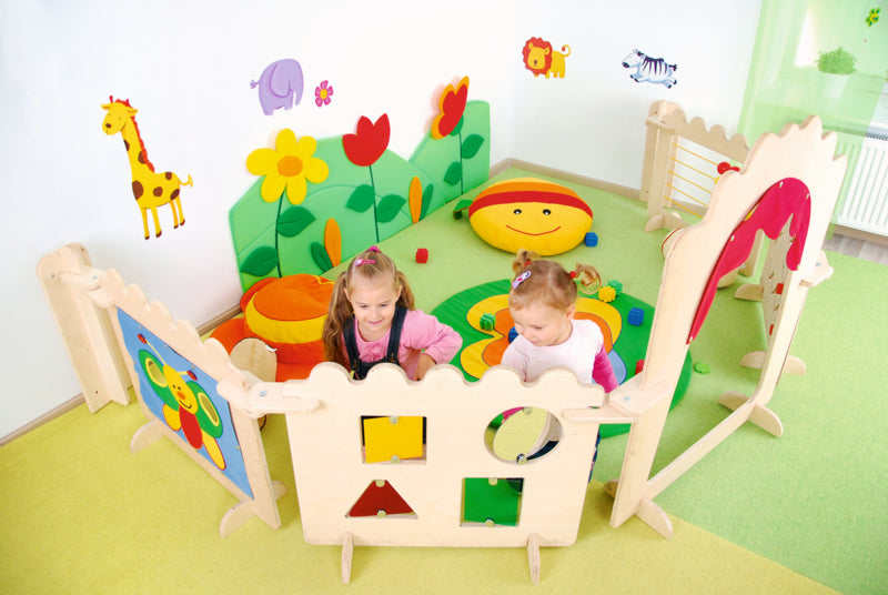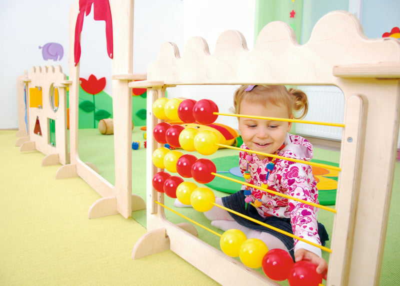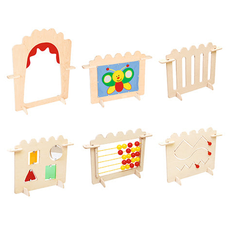 De scheidingswanden bestaan uit modules gemaakt van multiplex. Elke module biedt verschillende soorten activiteiten voor kinderen, doolhoven, beweegbare plexiglas en spiegelfiguren, telraam, stoffen vlinder.