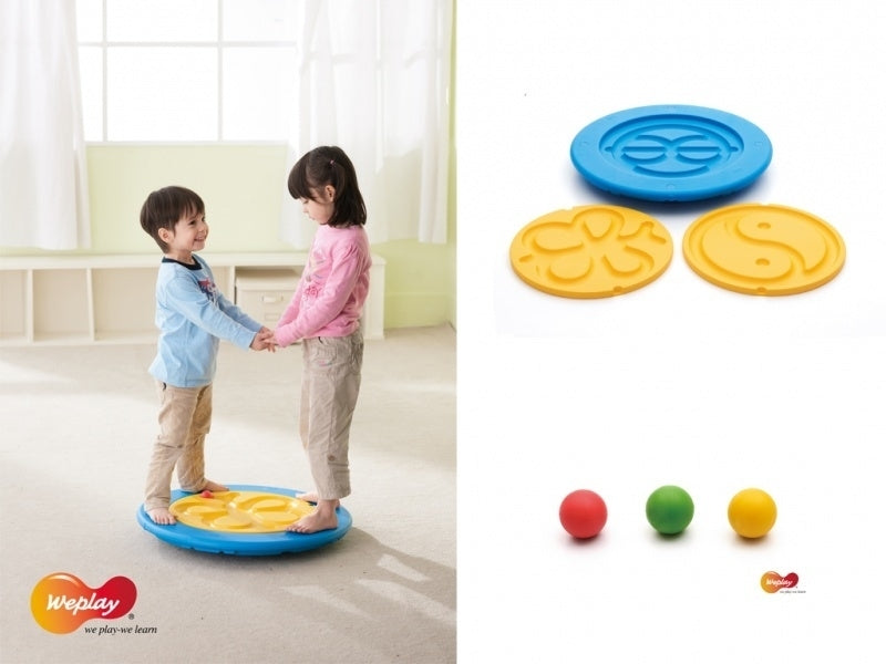 Inh.: 1 balans bord, 3 ballen, 2 inzetborden.
