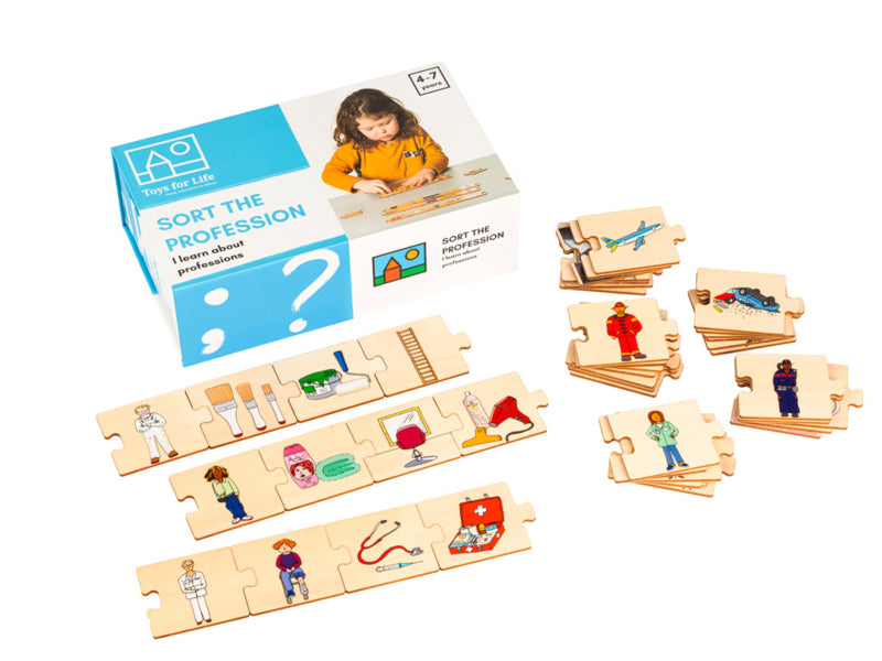 Verzamel de juiste puzzelstukjes van elk beroep. Maak kennis met de beroepen, breid je woordenschat uit en train de fijne motoriek. Omdat alle puzzelstukjes in elkaar passen, kunnen er veel verschillende verhalen worden verteld.