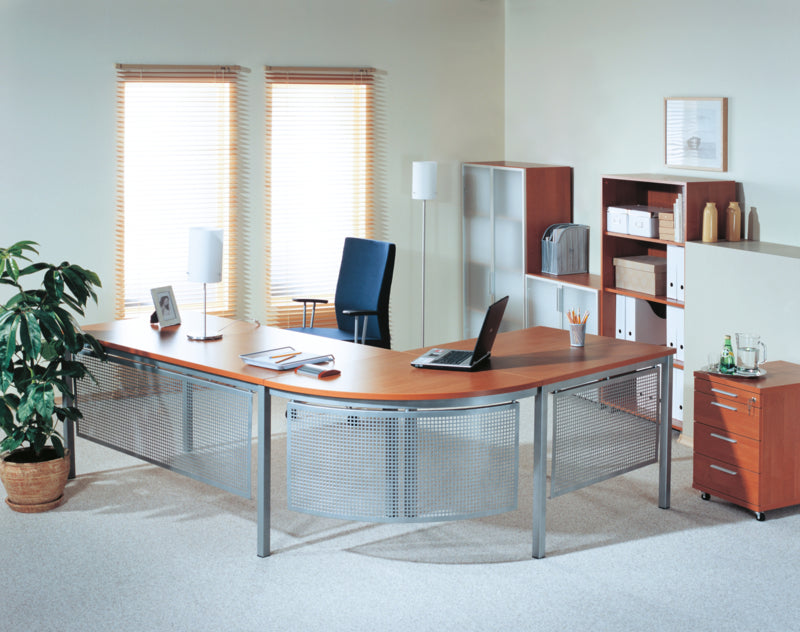 Vrijstaande container op wielen, gemaakt van gelamineerd spaanplaat in elzen kleur (dikte: 18 mm), randband dikte: 2 mm. Complete uitrusting: pennenla, centrale vergrendeling, stopbedieningsmechanisme in laden beschermt tegen het tegelijkertijd openen van meer dan één lade.