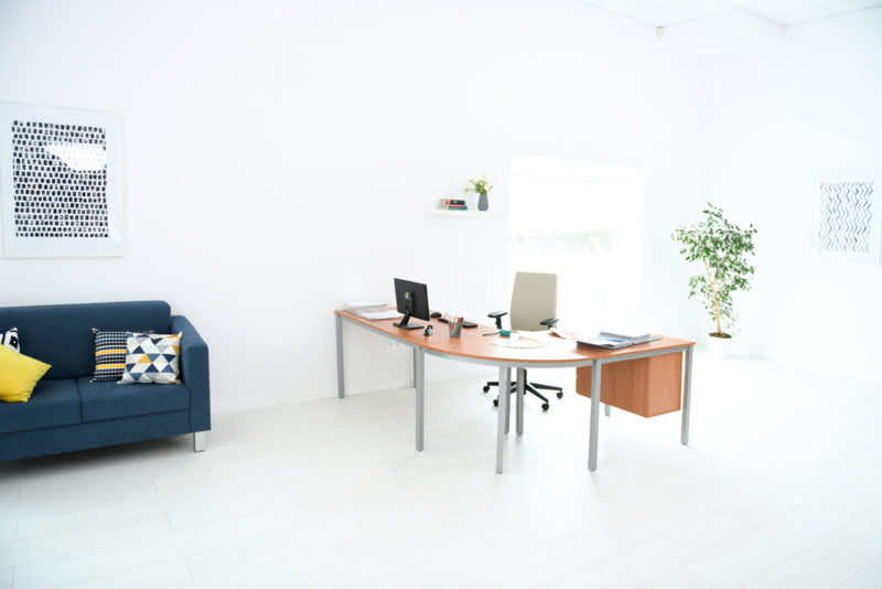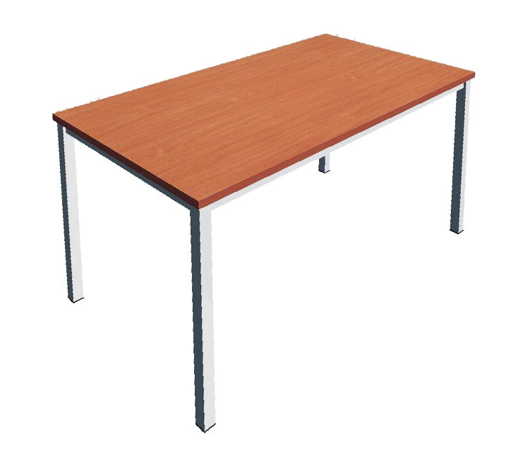 Bureau tafel op metalen frame met vierkante poten in aluminium kleur (40 mm.) met tafelblad van gelamineerd spaanplaat in een elzen kleur (dikte 18 mm.). Randband dikte 2 mm.