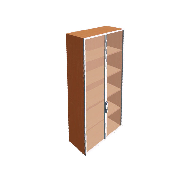 Vitrine kast van gelamineerd spaanplaat in een elzen kleur (dikte 18 mm.). Randband dikte 0,5 en 2 mm. Met metalen poten in een aluminium kleur. Vitrine deuren van gezandstraald glas (dikte 4 mm.) in een metalen frame en met metalen handgrepen.