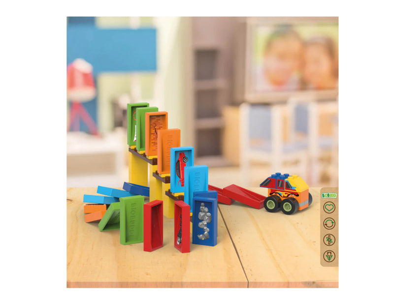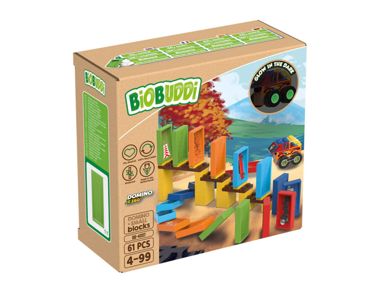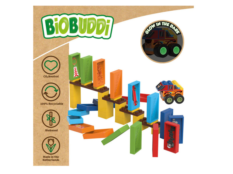 Uiteindelijk bouwen ze een unieke baan met allerlei toffe uitdagingen. Het is te gek om je eigen dominobaan te bouwen. Er is zelfs een kleine auto die uit blokken kan worden gebouwd. Deze auto kan alle dominostenen omver duwen. Begin plezier te maken met BiOBUDDi.