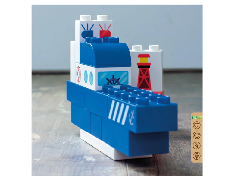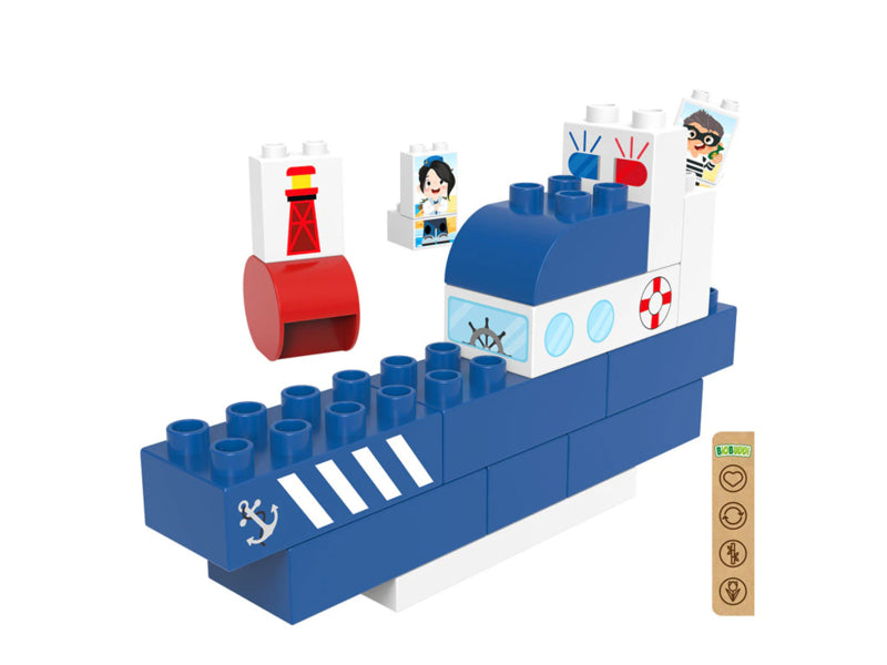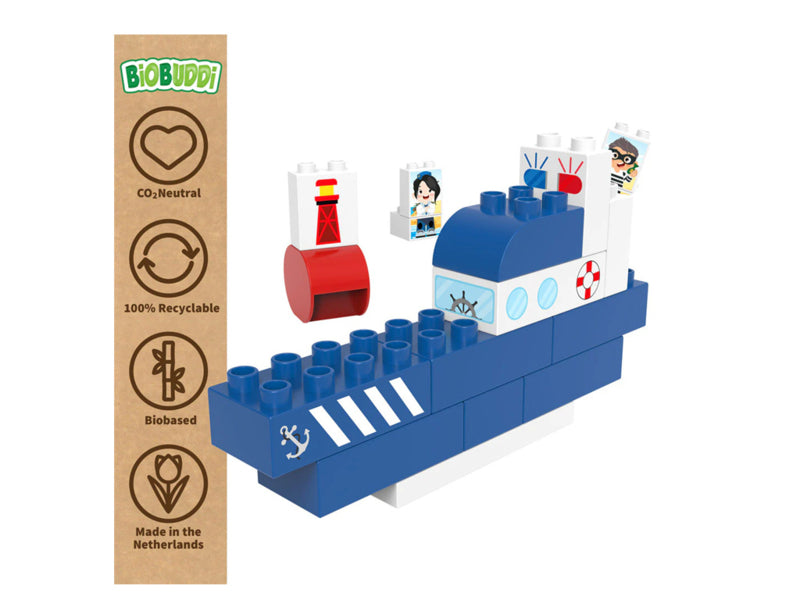 BiOBUDDi speelgoedsets zijn perfect voor het ontwikkelen van vroege bouw- en rollenspelvaardigheden bij kinderen. De speelset politie boot bestaat uit 17 verschillende onderdelen, gemaakt van resten uit de suikerriet plant. De blokken zijn milieuvriendelijk, recyclebaar, duurzaam en ook uitwisselbaar met andere merken. De verpakking is zo ontworpen dat het onderdeel uit maakt van het product. Het is gemaakt van FSC karton en met een simple ‘push’ kan je gemakkelijk verschillende kaartjes eruit halen en zetten in de bijgevoegde kaarthouders voor nog meer speel plezier.
