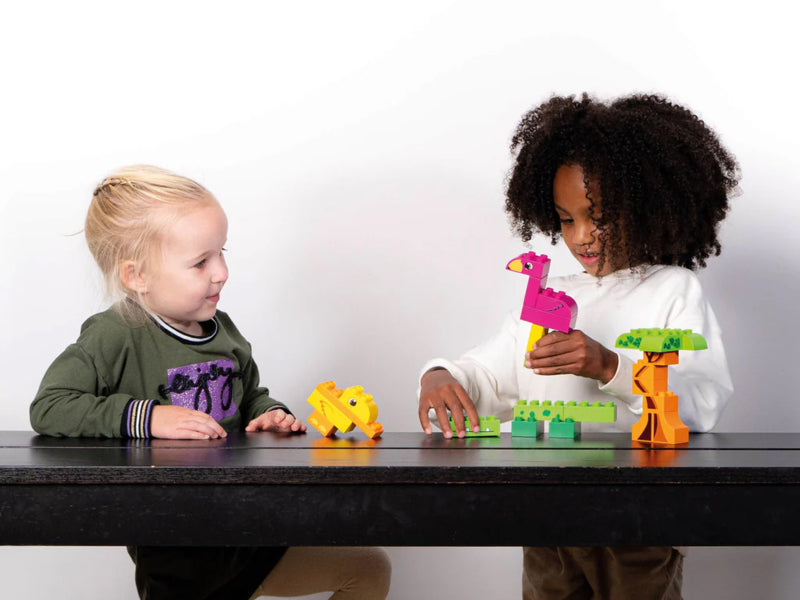 Kinderen kunnen met deze set een krokodil, flamingo, eend en tropische boom bouwen om kennis te maken met het dierenrijk, maar ze kunnen ook iets anders bouwen. Volg het instructieboekje of gebruik je fantasie en bouw iets anders. Bouwen en spelen met speelgoedblokken is goed voor de motorische, creatieve en cognitieve ontwikkeling van kinderen.