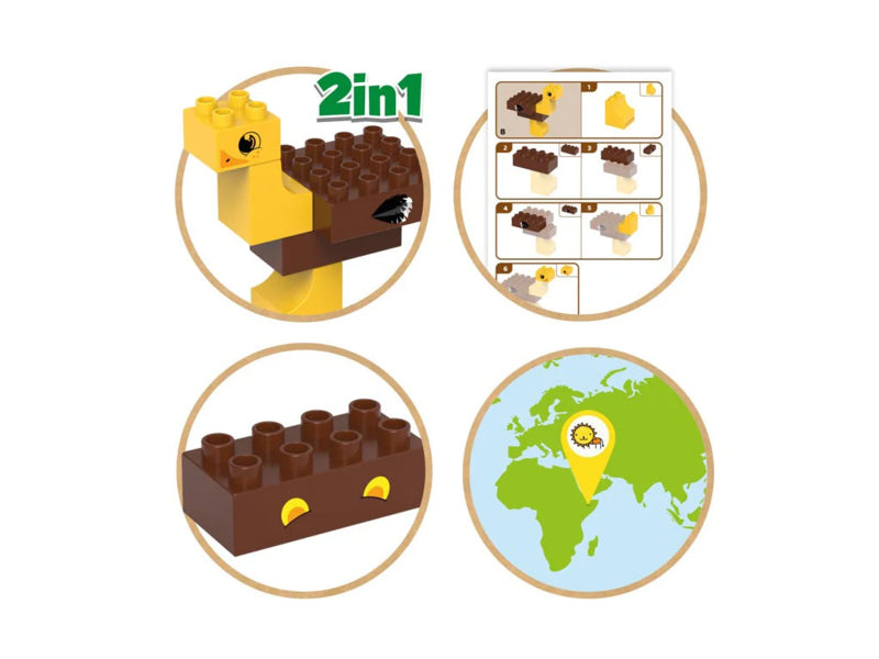De Savanna set bestaat uit speelgoedblokken met een warm en avontuurlijk thema. Bouw samen met je peuter of kleuter de grote leeuw of de snelle struisvogel met behulp van de bouwinstructies of bedenk een fantasiedier! Bouwen met blokken stimuleert niet alleen de ontwikkeling van creatieve vaardigheden, maar ook van cognitieve, emotionele en motorische vaardigheden.