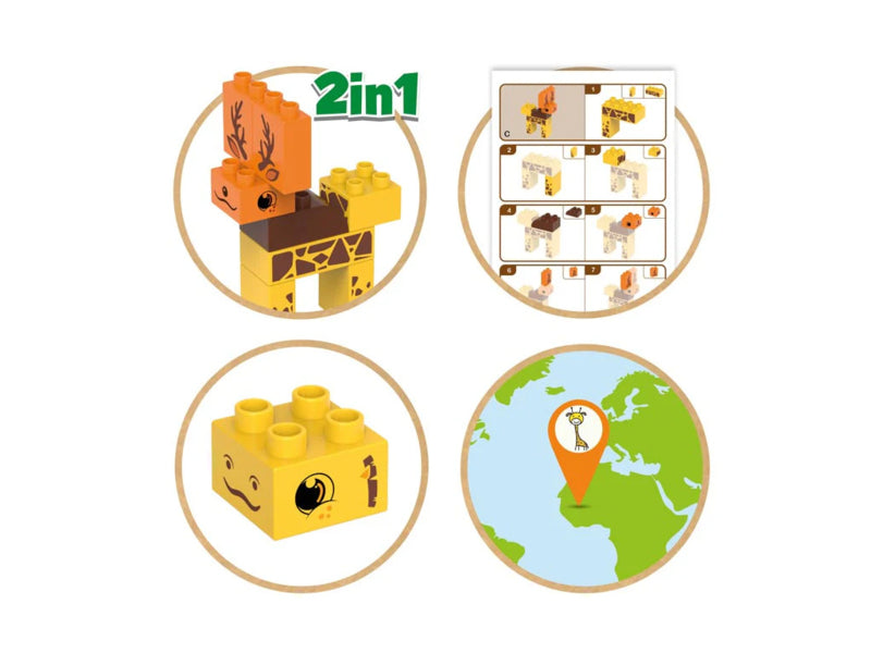Deze set bestaat uit twee giraffen en een hert, maar je kan ook samen met je kleintje een andere creatie bedenken. Bouw de giraffe of het hert met behulp van het leerboek en stimuleer de ontwikkeling van de fijne motoriek van je kind. Kan jouw peuter een giraf herkennen en benoemen?