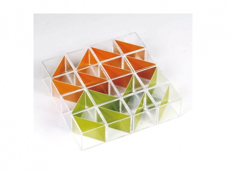 Totaal 16 doorschijnende blokken (8 x geel/oranje en 8 x groen/blauw) en 6 voorbeeldkaarten met voorbeeldboekje.