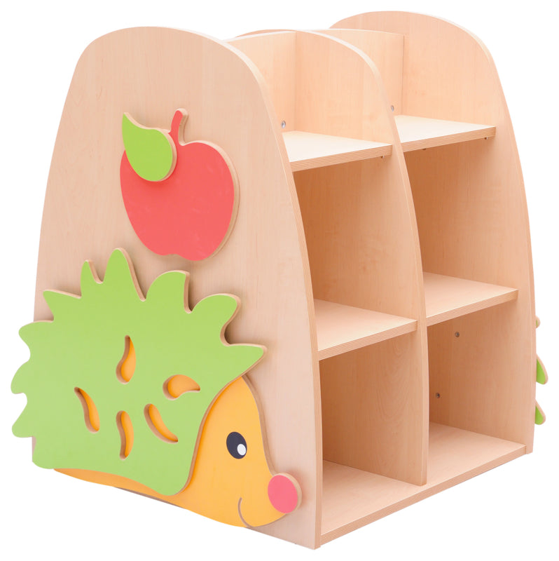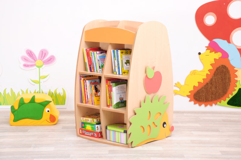 Bibliotheek met applicaties van egels en appels aan de zijkanten ervan.
