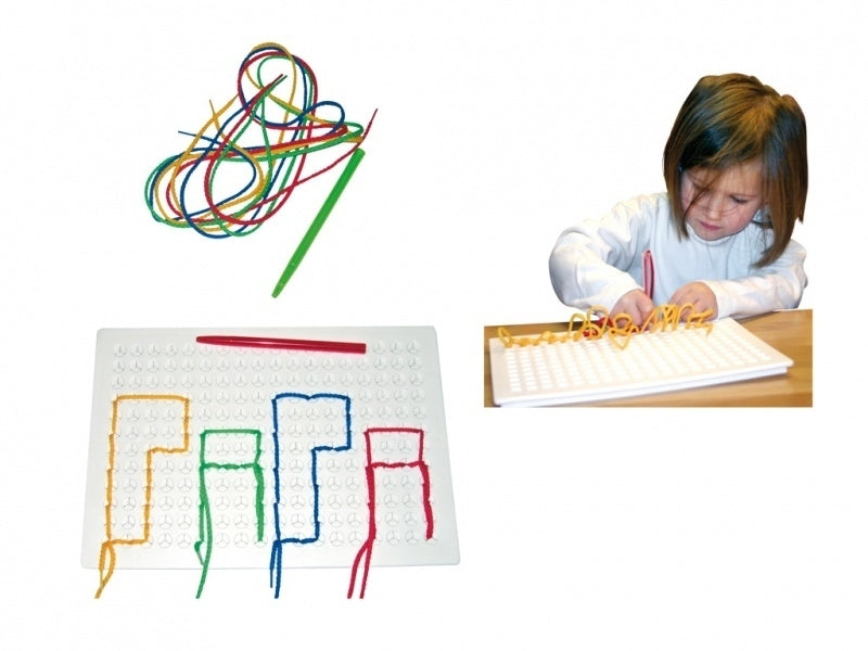Inh.: 4 speelborden, 16 rijgsnoeren van 1 m. in 4 kleuren, 4 lila rijgsnoeren van 1.5 m. en 4 borduurpennen.