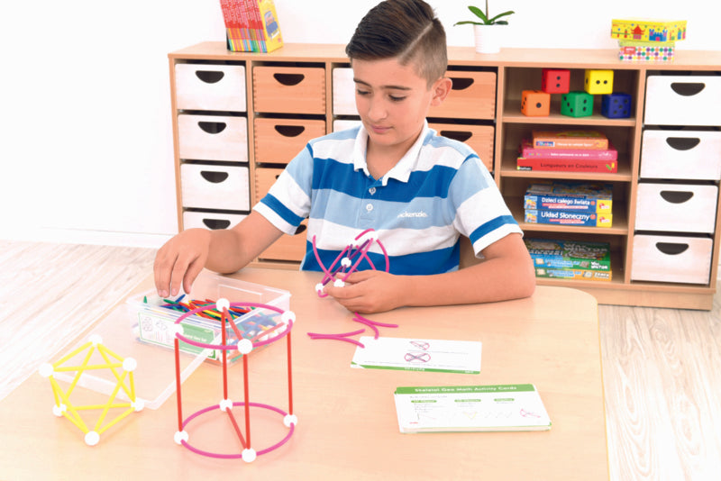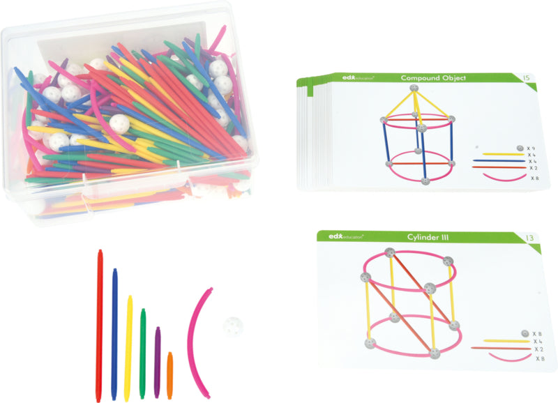 Een reeks kleurrijke plastic ballen en stokken, in verschillende maten en vormen, om ruimtelijke geometrische figuren te creëren.