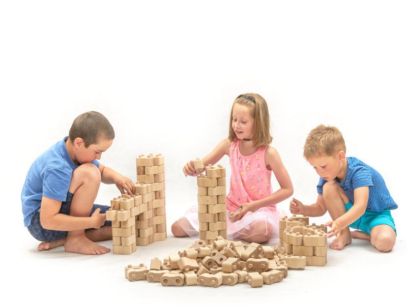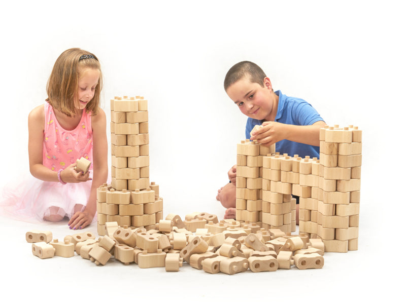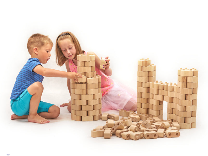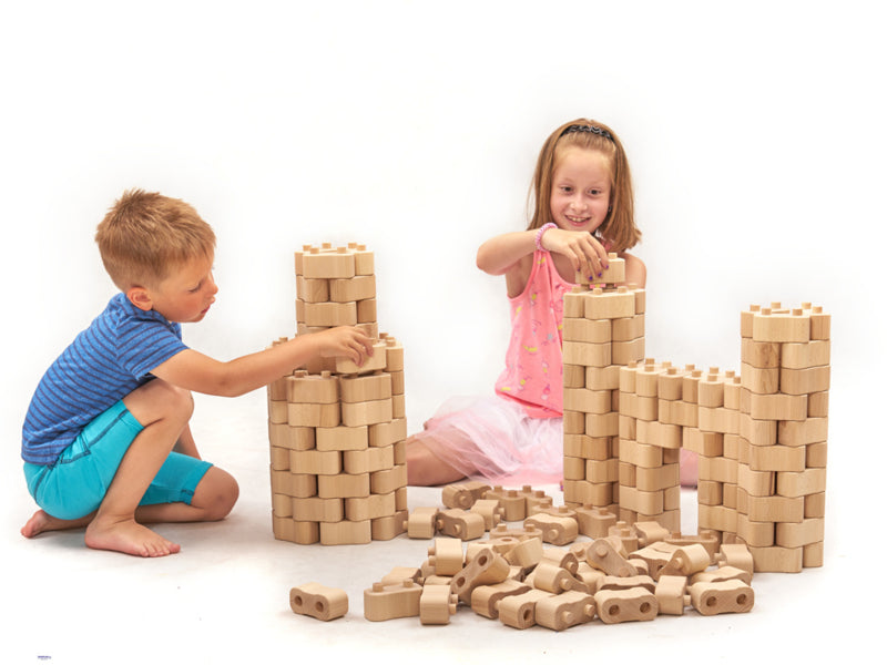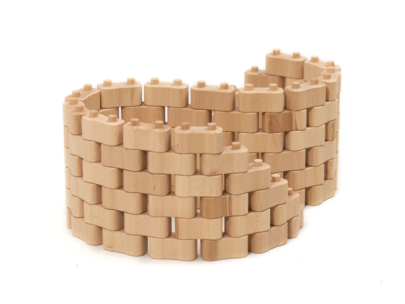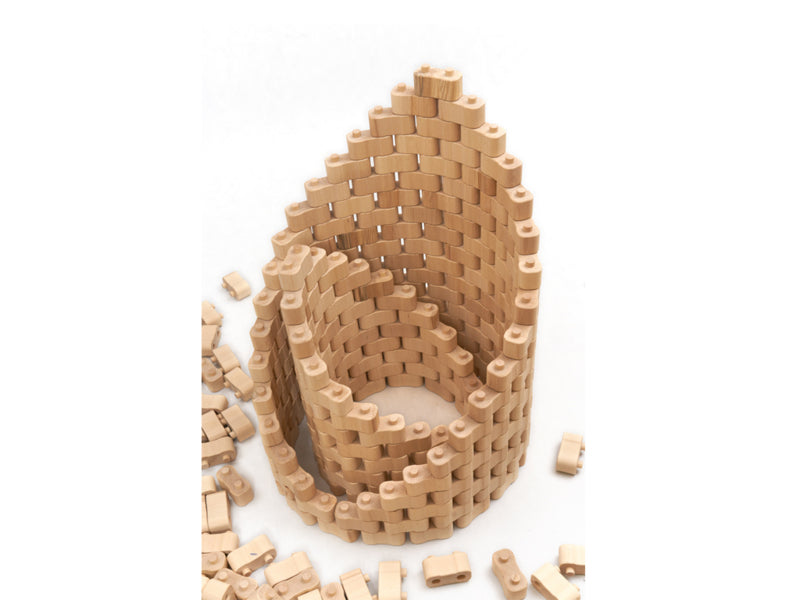 Wat kun je bouwen met slechts één steensoort? Veel stuks, want door de twee ronde pennen en afgeronde uiteinden kunnen de houten bouwstenen onder elke hoek met elkaar worden verbonden. Naast rechthoekige vormen zijn ook ronde en gebogen vormen mogelijk. Hierdoor kan de verbeelding veel creatieve ideeën ontwikkelen en uitvoeren. De bouwstenen zijn eenvoudig in elkaar te zetten en daarom ook geschikt voor jongere kinderen van wie de motoriek nog moet worden ontwikkeld.