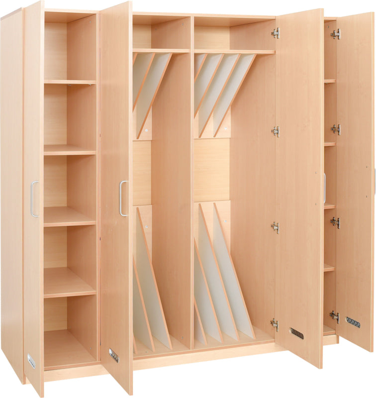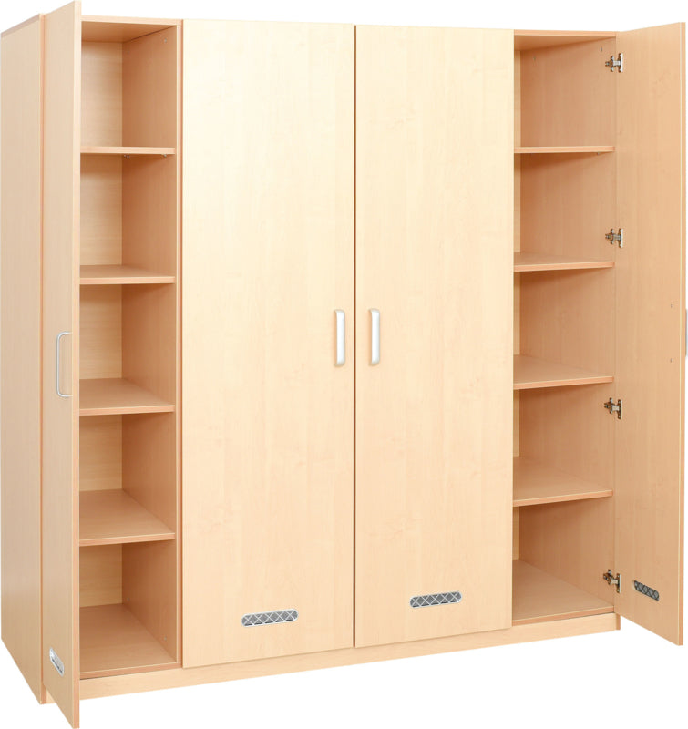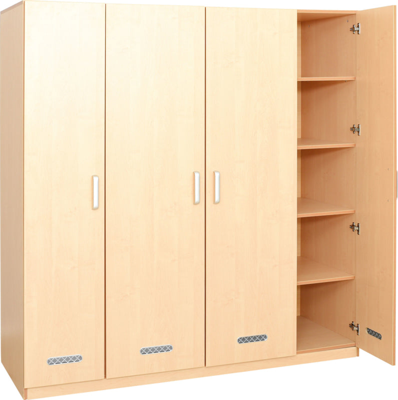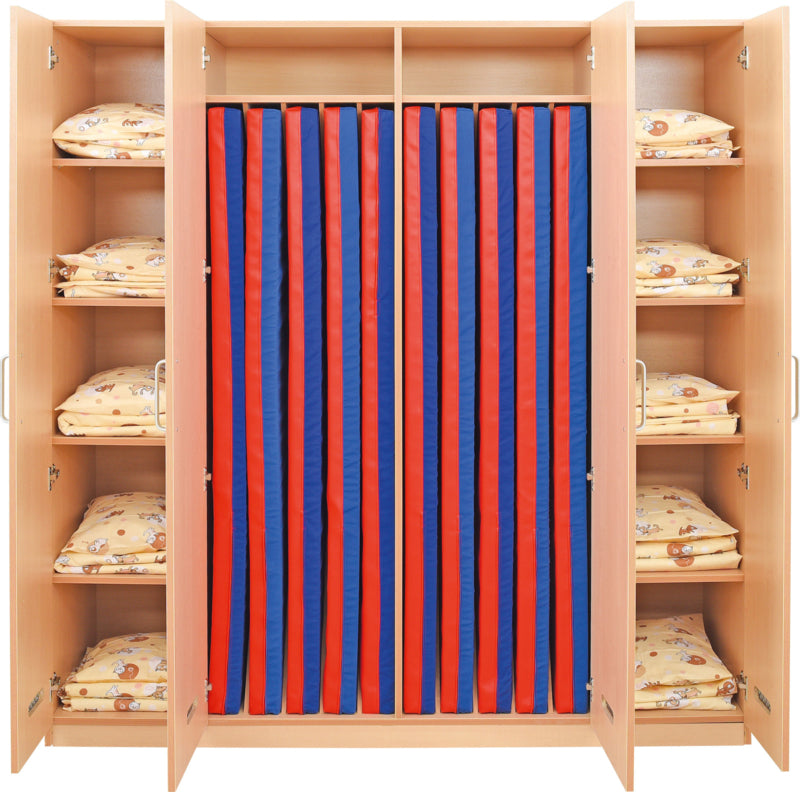 Vierdeurs kast met plint voor 10 matrassen en opbergruimte voor 10 sets beddengoed.