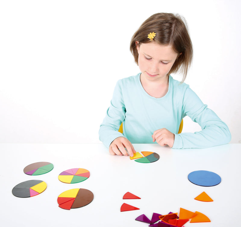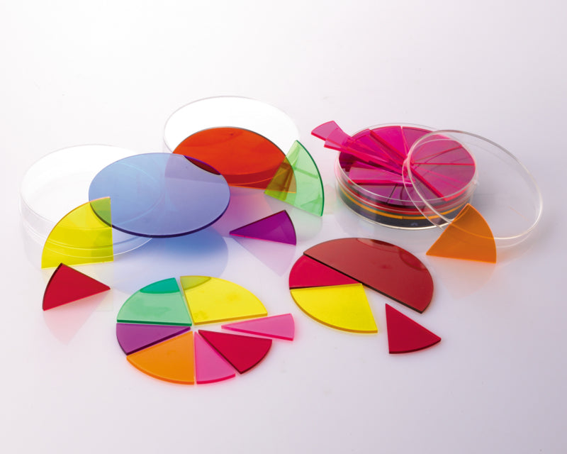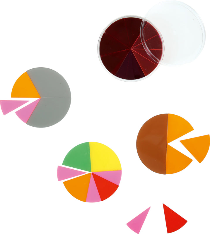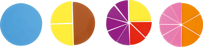 9 kleurrijke cirkels gemaakt van transparant plastic, verdeeld in delen van 1/2 tot 1/12.