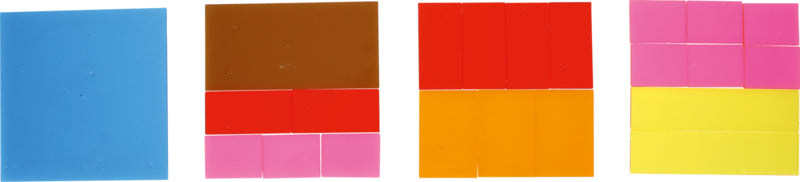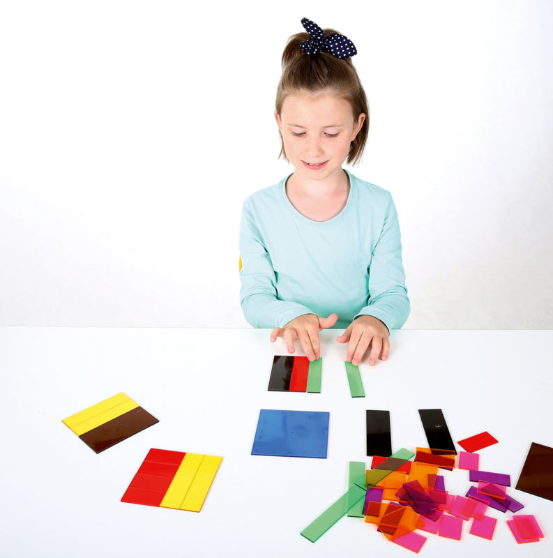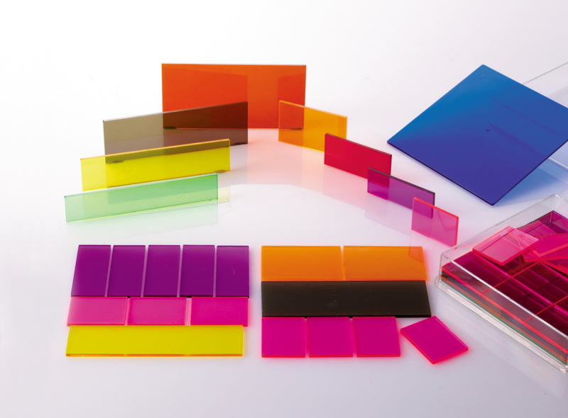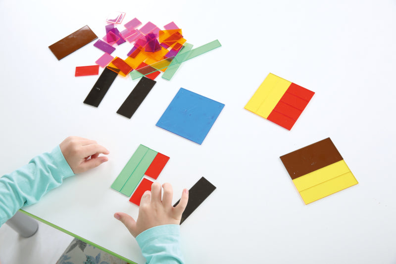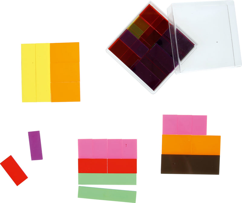 9 kleurrijke vierkanten, gemaakt van transparant plastic, verdeeld in delen van 1/2 tot 1/12.