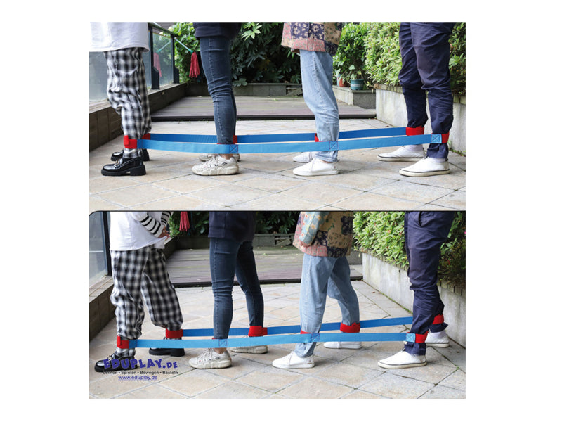 Dankzij klittenband is het aantrekken van de beenlussen kinderspel en zorgt het voor een optimale pasvorm. Als team trainen de kinderen nu hun coördinatie om samen verder te komen. Een gevoel van evenwicht, communicatie en sociale interactie worden ook bevorderd. In een kleine race kunnen verschillende teams elkaar motiveren om hun vaardigheden te verbeteren.