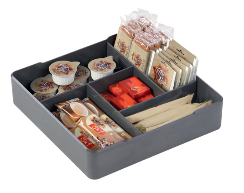 - Met onderverdelingen, ideaal voor suikersticks, melkcups en andere accessoires voor koffie.