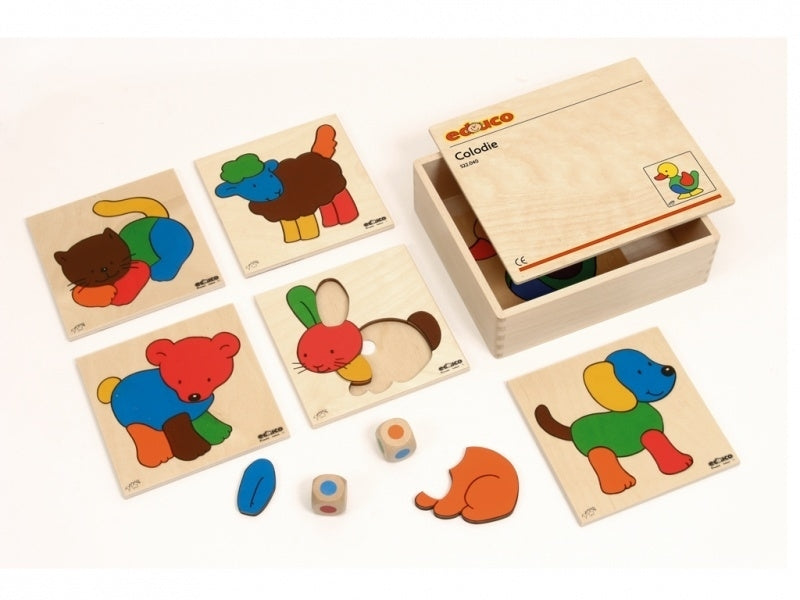 Eenvoudige dierenpuzzels, bestaande uit 6 delen in 6 verschillende kleuren. Met de 2 meegeleverde kleurendobbelstenen kan een gezelschapsspel gespeeld worden.