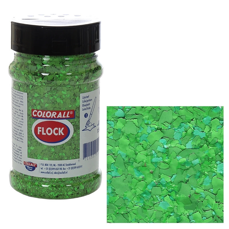 Breng een laag verf of Colorall Vernislijm aan. In deze nog natte verf of lijm strooit u de verfsnippers. Naarmate je van grotere hoogte strooit verdelen de verfsnippers zich gelijkmatiger (als sneeuw). De FLOCK verfsnippers kunnen met de hand vermalen worden om nog fijner te kunnen werken. Na droging voorzichtig met een schuurspons de losse delen wegschuren. Hierna kunt u met Collall Decoupagevernis / Collall Deco Sealer het geheel afwerken. Sterk zuigende materialen een keer voorbehandelen met bijvoorbeeld Colorall Gesso. Doordat de vlokken poreus zijn zuigen ze de kleur van de verf/ lijm gedeeltelijk op. FLOCK geeft op iedere kleur verf dus steeds een ander resultaat!