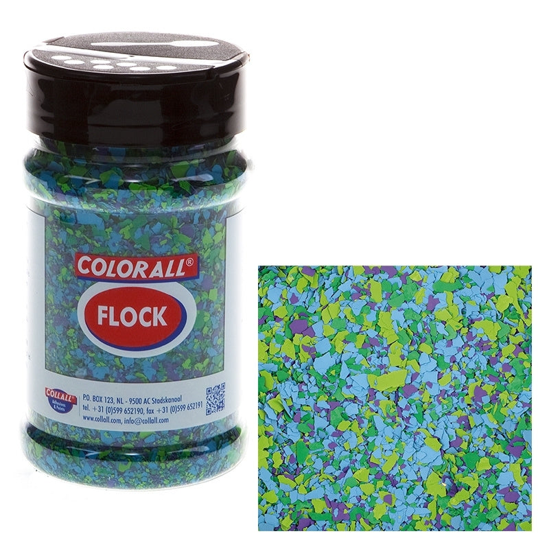 Breng een laag verf of Colorall Vernislijm aan. In deze nog natte verf of lijm strooit u de verfsnippers. Naarmate je van grotere hoogte strooit verdelen de verfsnippers zich gelijkmatiger (als sneeuw). De FLOCK verfsnippers kunnen met de hand vermalen worden om nog fijner te kunnen werken. Na droging voorzichtig met een schuurspons de losse delen wegschuren. Hierna kunt u met Collall Decoupagevernis / Collall Deco Sealer het geheel afwerken. Sterk zuigende materialen een keer voorbehandelen met bijvoorbeeld Colorall Gesso. Doordat de vlokken poreus zijn zuigen ze de kleur van de verf/ lijm gedeeltelijk op. FLOCK geeft op iedere kleur verf dus steeds een ander resultaat!