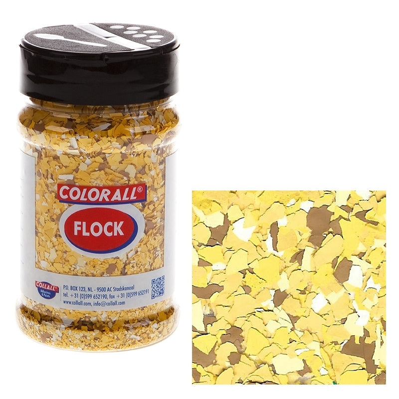 Breng een laag verf of Colorall Vernislijm aan. In deze nog natte verf of lijm strooit u de verfsnippers. Naarmate je van grotere hoogte strooit verdelen de verfsnippers zich gelijkmatiger (als sneeuw). De FLOCK verfsnippers kunnen met de hand vermalen worden om nog fijner te kunnen werken. Na droging voorzichtig met een schuurspons de losse delen wegschuren. Hierna kunt u met Collall Decoupagevernis / Collall Deco Sealer het geheel afwerken. Sterk zuigende materialen een keer voorbehandelen met bijvoorbeeld Colorall Gesso. Doordat de vlokken poreus zijn zuigen ze de kleur van de verf/ lijm gedeeltelijk op. FLOCK geeft op iedere kleur verf dus steeds een ander resultaat!