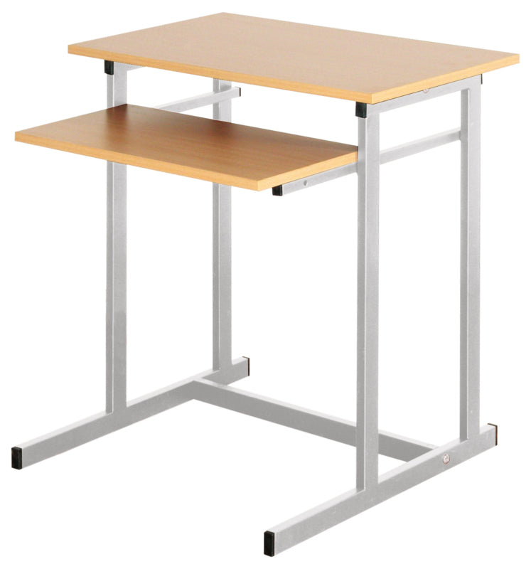 Computerbureau op metalen constructie, werkbladen van gelamineerd spaanplaat (dikte: 18 mm), met randafwerking (dikte: 2 mm). Ze hebben een vaste toetsenbordlade en de mogelijkheid om een extra plank voor de computer te monteren (F052420, wordt apart verkocht).