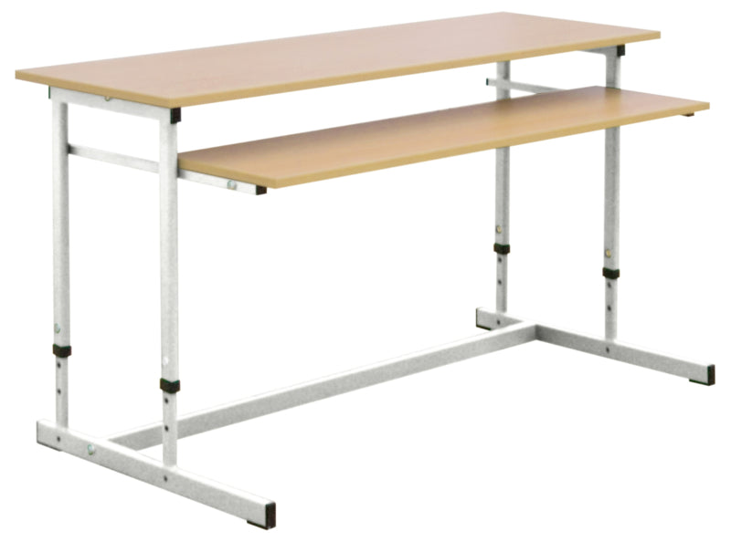 Computerbureau op metalen constructie, met verstelbare hoogte, werkbladen van gelamineerd spaanplaat (dikte: 18 mm), met randafwerking (dikte: 2 mm). Ze hebben een vaste toetsenbordlade en de mogelijkheid om een extra plank voor de computer te monteren (F052420, wordt apart verkocht).