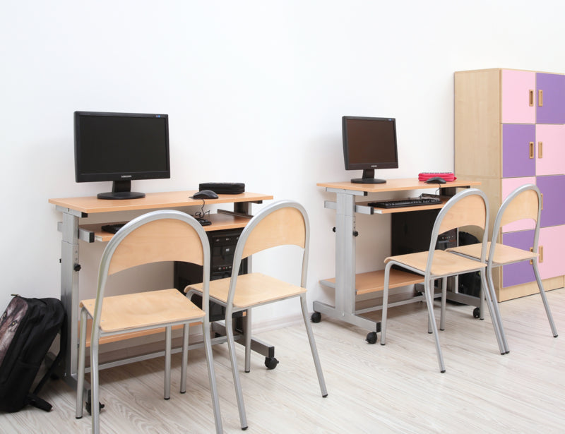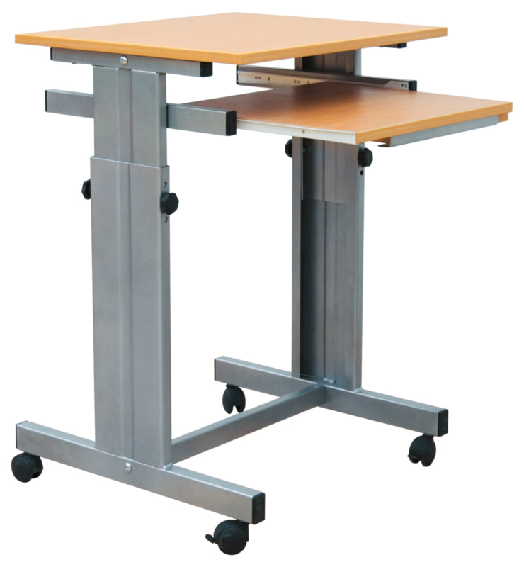 Verplaatsbaar computerbureau, op metalen frame, met verstelbare hoogte. Werkblad van gelamineerd spaanplaat (dikte: 18 mm), met randafwerking (dikte: 2 mm). Met uittrekbare toetsenbordlade.