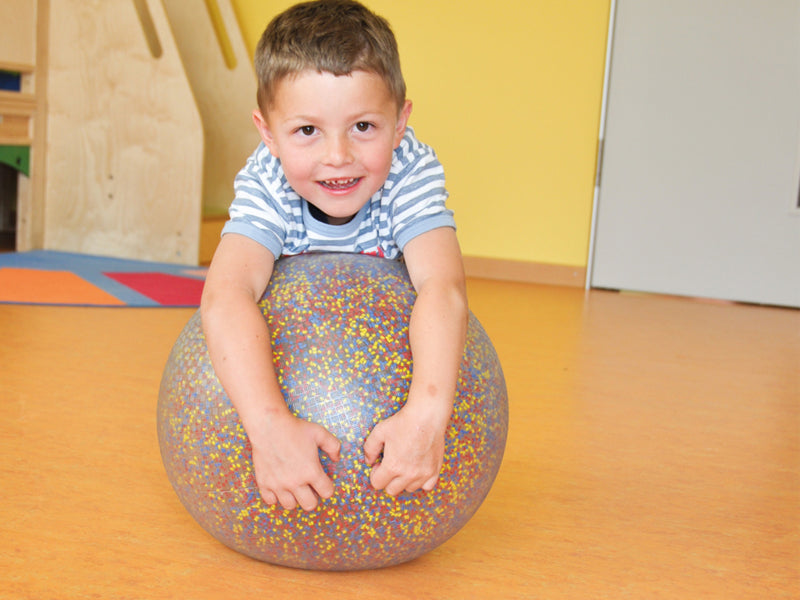 Bal gemaakt van transparante gummi gevuld met kunststof confetti.