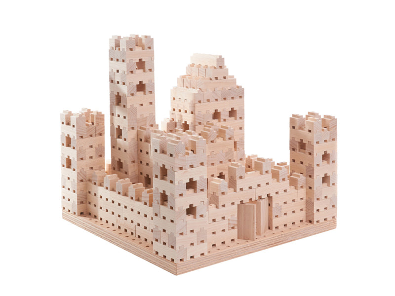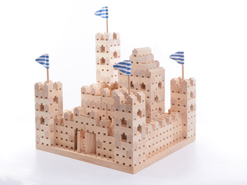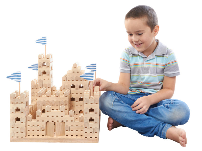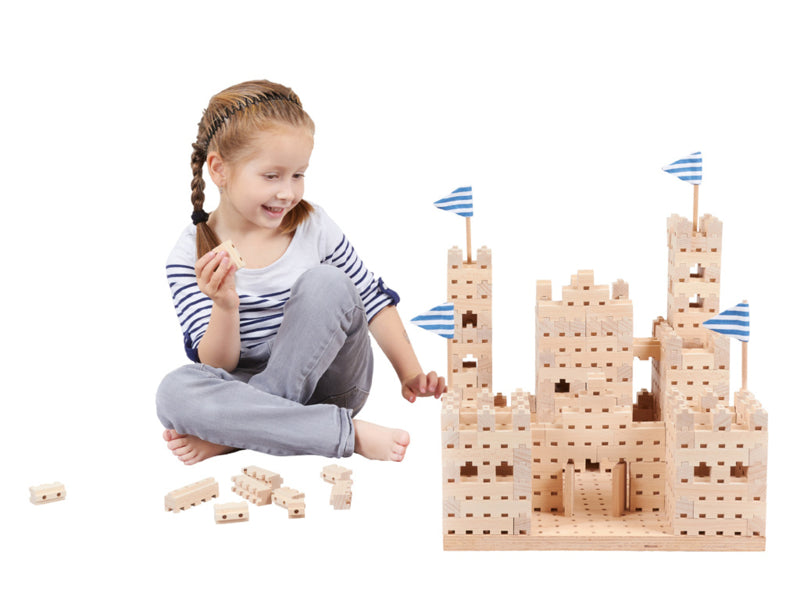 ... Van 360 bouwstenen in vier maten kunnen kinderen indrukwekkende bouwwerken bouwen ... b.v. een ridderburcht. Ramen worden gemaakt door metselwerk weg te laten en er vervolgens overheen te bouwen. De kleinste stenen zijn zeer geschikt voor kantelen en torentjes. Een poort geeft toegang. Verticale staven in twee lengtes verbinden de stenen en geven de wanden steun. Bij elke constructie leren de kinderen, verbeteren ze hun concentratie, ontwikkelen ze een toekomstgerichte mindset en fijne motoriek.