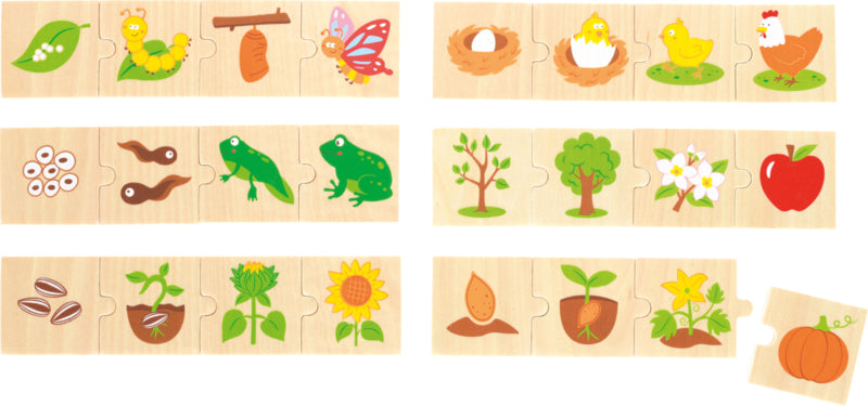 Een set van 6 puzzels die de cyclus van dier- en plantontwikkeling tonen (kip, kikker, vlinder, tomaat, pompoen en zonnebloem.) Elke puzzel bestaat uit 4 delen. De puzzels ontwikkelen geheugen, het vermogen om kritisch te denken en te analyseren.