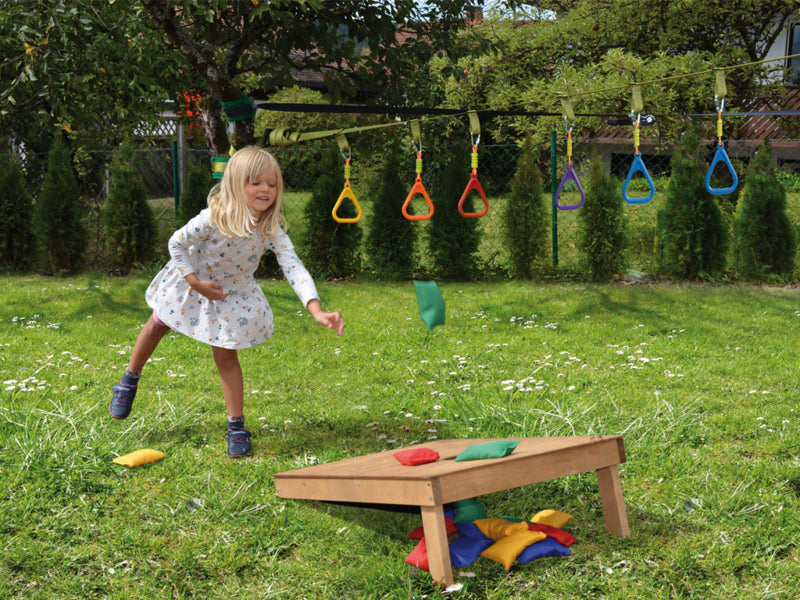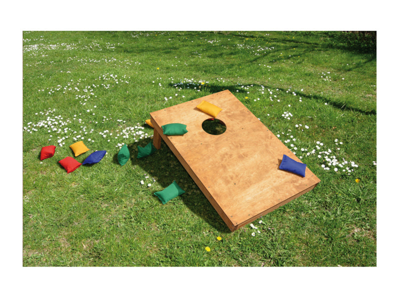 Wie erin slaagt om de zak door het gat te gooien krijgt drie punten en wie het doelbord raakt krijgt één punt. Vanwege de afstand tot het licht hellende houten bord, kan de moeilijkheidsgraad worden gevarieerd - dus zelfs de kleintjes hebben plezier met cornhole, zoals het spel voor binnen en buiten met de eenvoudige regels ook wordt genoemd. Inhoud: plank, 8 x bonenzakjes 15 x 9 cm elk 2x blauw, 2 x rood, 2 x geel, 2 x groen, montagehandleiding.