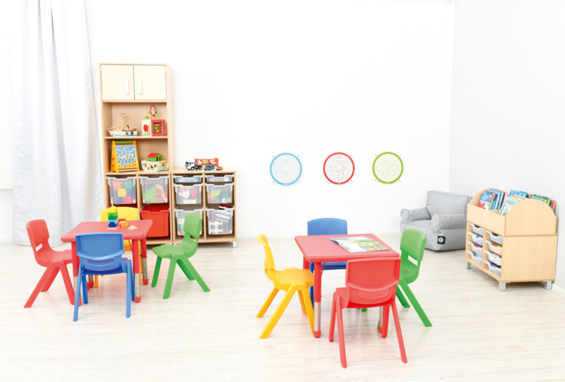 Duurzame tafel van PE, met staal, verstelbare poten met bescherming tegen krassen op de vloer.
