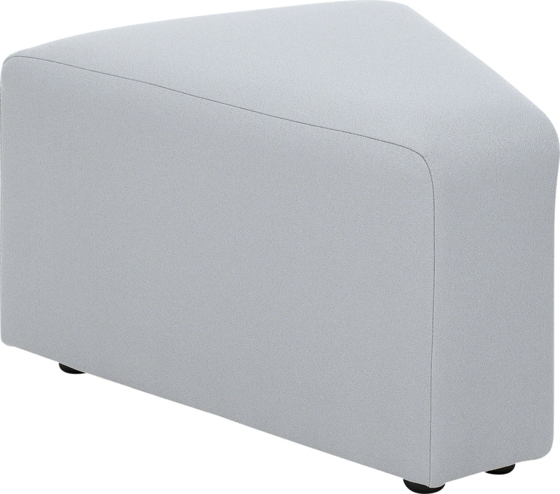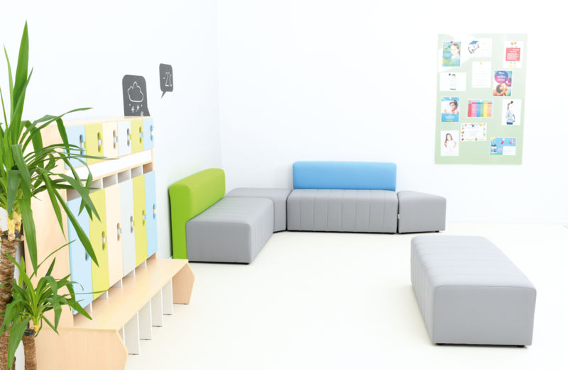 Foam zitje/poef op een houten frame, bedekt met vlamvertragende stof, prettig in aanraking.