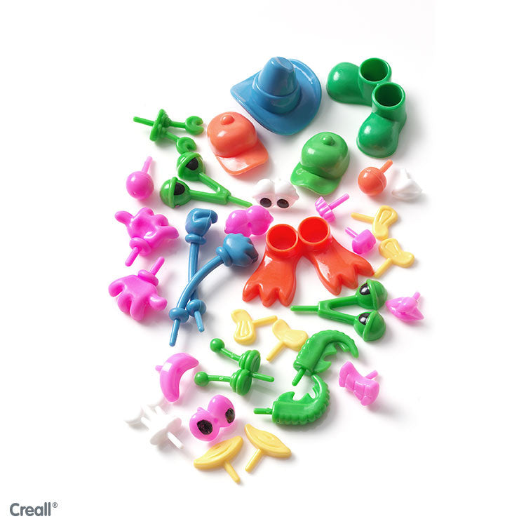 Assortiment van komische lichaamsdelen voor het maken van klei poppetjes.