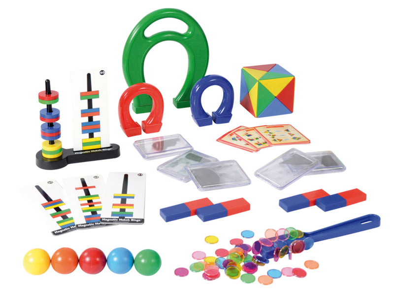 Inhoud: 1 spel met zwevende ringen, 3 hoefijzermagneten, 1 magneet dobbelsteen met 21 voorbeelden, 5 ijzerpoeder doosjes, 5 magnetische ballen, 4 rechthoekige magneten en 1 magneetstaaf met 50 kleurrijke chips.