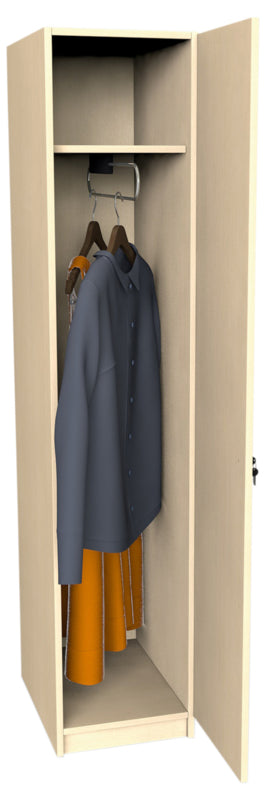 Kasten van gelamineerd spaanplaat (dikte: 18 mm). Met hoedenplank en intrekbare hanger.