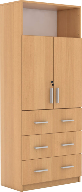 Hoge ladenkast met open vak van gelamineerd spaanplaat (dikte: 18 mm).