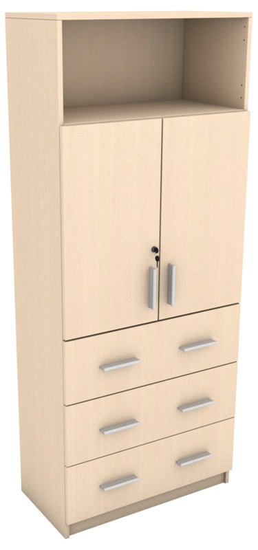 Hoge ladenkast met open vak van gelamineerd spaanplaat (dikte: 18 mm).