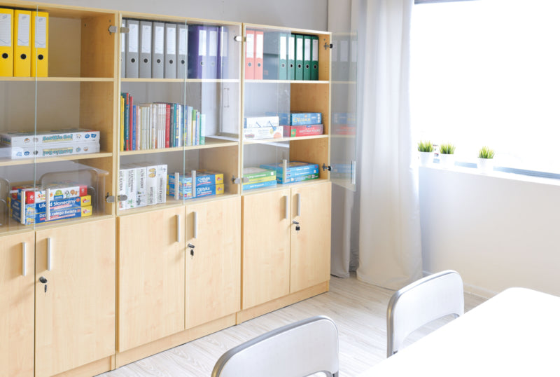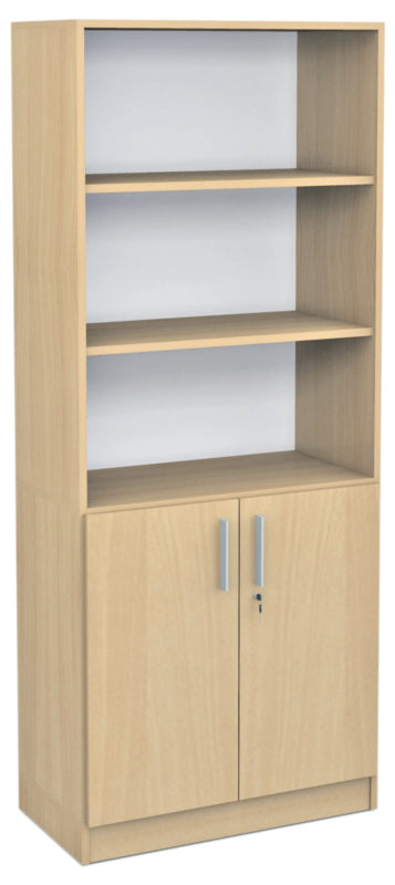 Hoge kast met vitrine in het bovenste gedeelte en volle deuren in het onderste gedeelte, gemaakt van gelamineerd spaanplaat (dikte: 18 mm).