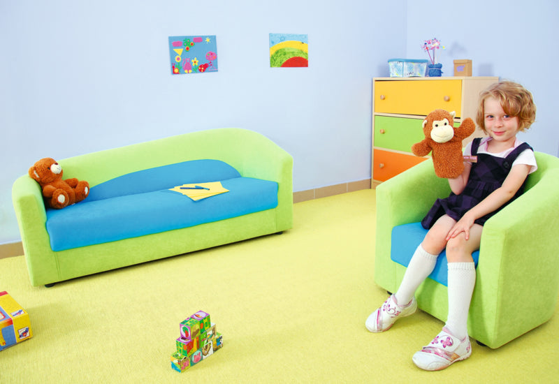 Esthetisch gemaakte bank bekleed met meubelstof, aangepast aan de lengte van kinderen. De houten constructie zorgt voor stabiliteit en comfort.