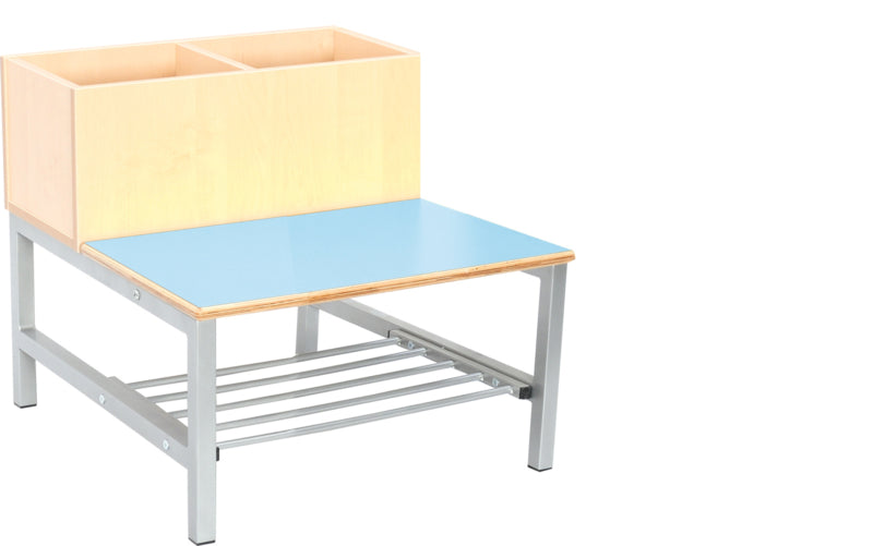 Garderobe bank op een stabiel metalen frame met schoenenrek. Zitting van multiplex met gekleurd HPL laminaat (dikte 19 mm.). Met 2 of 4 compartimenten voor accessoires. Gemaakt van gelamineerd spaanplaat in een berken kleur met ABS rand.