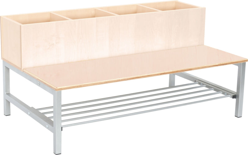 Garderobe bank op een stabiel metalen frame met schoenenrek. Zitting van multiplex met gekleurd HPL laminaat (dikte 19 mm.). Met 2 of 4 compartimenten voor accessoires. Gemaakt van gelamineerd spaanplaat in een berken kleur met ABS rand.